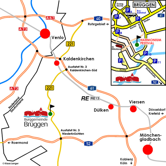 Die wichtigste Information ist zunächst einmal sicher die Anreise. Die Burggemeinde Brüggen finden Sie auf der Karte verortet, dazu eine Skizze der Ortsmitte, wo auf der Burg das Zweite Europäische Harmoniumfestival stattfindet. Diesen Plan können Sie auch als PDF-Datei hier herunterladen. |