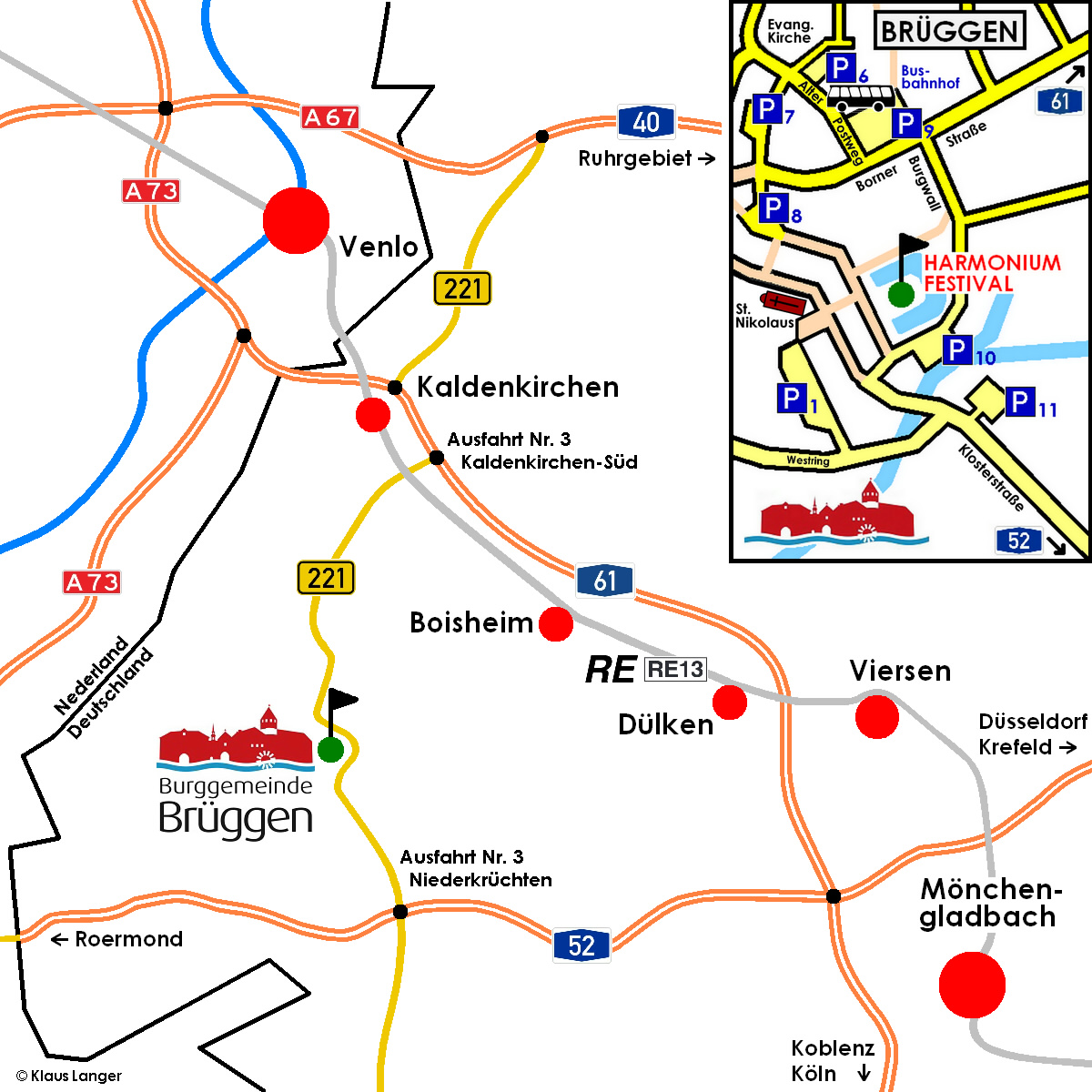 Your way to Brüggen situated in the North Rhine and Maas area may be the most important information you will need. Just take a look at the road map down below or get your own PDF-file copy of it right here. The more detailed village centre view leads you straight to the castle where the 4th European Harmonium Festival takes place. | |||||||